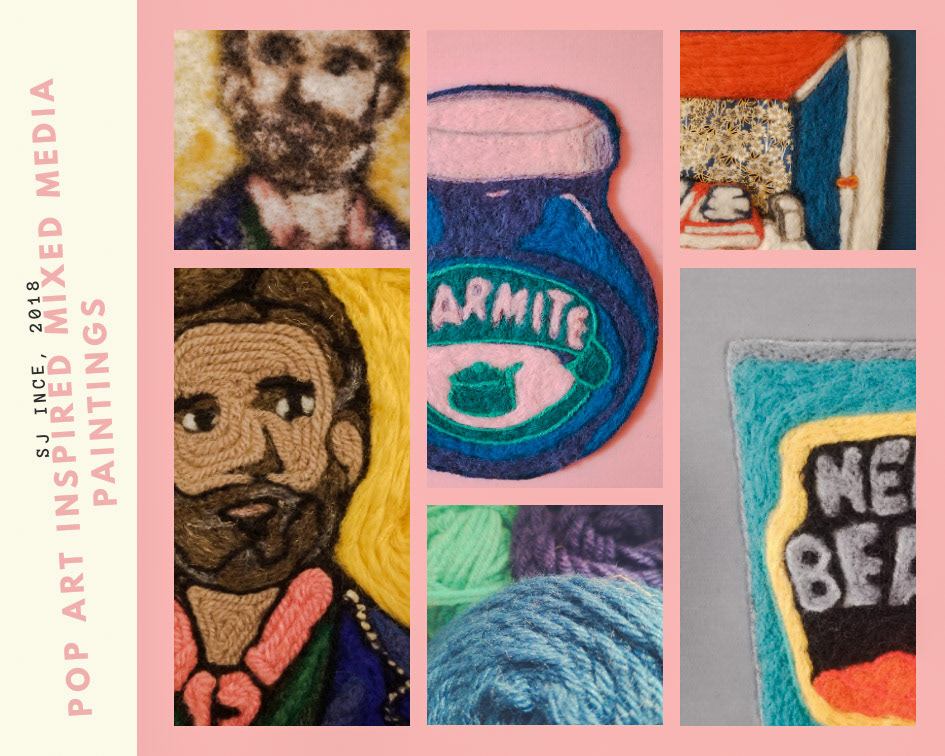 Pop Art inspired mixed media paintings and textile art by S J Ince, 2018